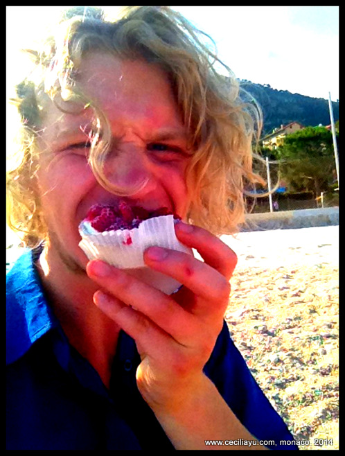 Zeph got a bit bored with my sunbaking pre-occuption and went to shop for food. 🙂 Good one, Zeph! He came back with Raspberry and Strawberry tarts from the french patiserrie. Yeah that’s practical!