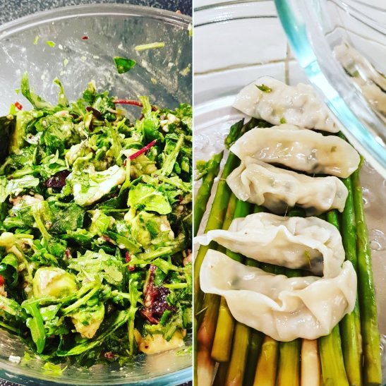 #Day1 Healthy simple for pre- #chinesenewyear2020 #detox with #dumplings of #riceflour #steamed on #greens #asparagus and Green #Superfoods #salad of #Avocado #tahinidressing #lemon #sesame #cranberry #sundriedtomatoesoil