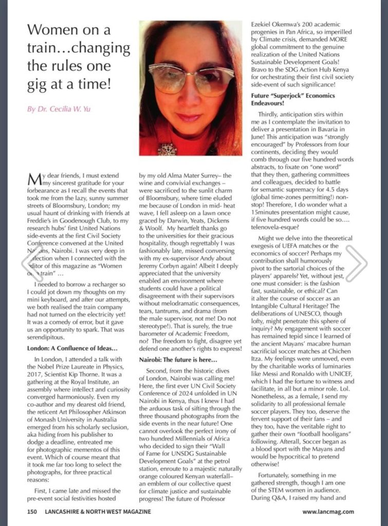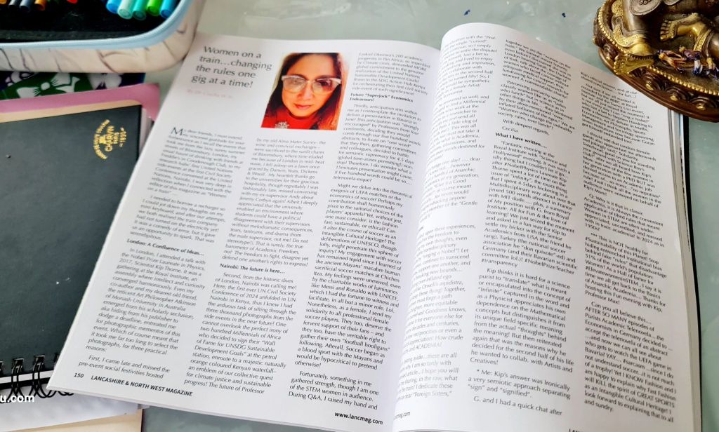 August 2024: Thank you Lancashire and Northwest Magazine for featuring my writing about Multidisciplinary Sustainability research as a female Economist, Nobel Physics talk by Laureate Kip Thorne in London, Cancer Research, STEM women in Academia and the modern state of 21stC British Feminism in the article titled,